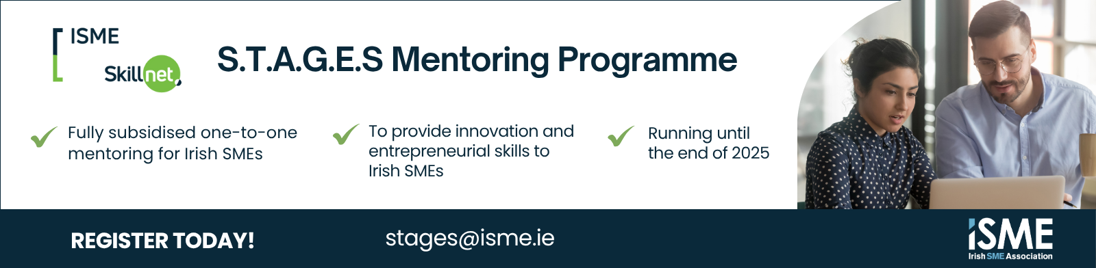 We are delighted to announce the launch of the S.T.A.G.E.S mentoring programme, whereby Irish SMEs can avail of fully-funded business consultancy services to help with Innovation and Entrepreneurial Practices. This mentoring programme is delivered by ISME Skillnet and will provide fully subsidised one-to-one mentoring. This programme is designed to help your business address real-world challenges and opportunities at each stage of your development, with expert-led sessions tailored to your specific goals.